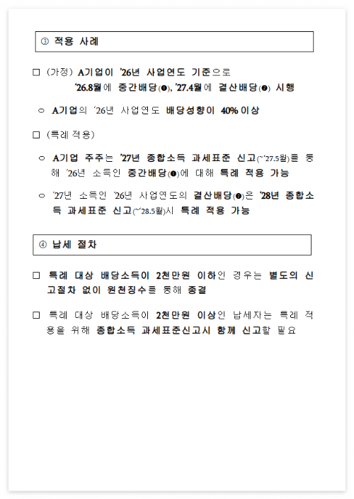 새로운 배당소득세율 체계는 모든 기업에 일괄 적용되는 방식이 아니라, 배당성향 조건을 충족한 기업의 배당에 우선 적용되는 형태입니다.