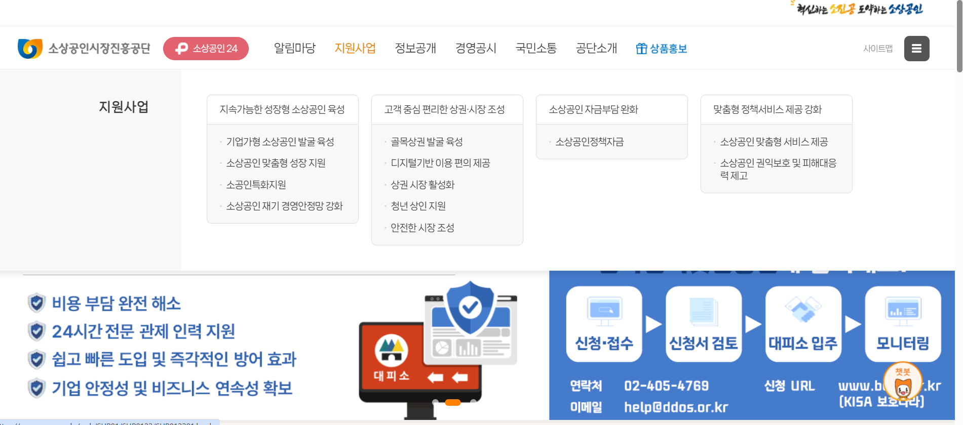 소상공인 시장진흥공단 홈페이지 핵심 메뉴에서 지원사업 찾기