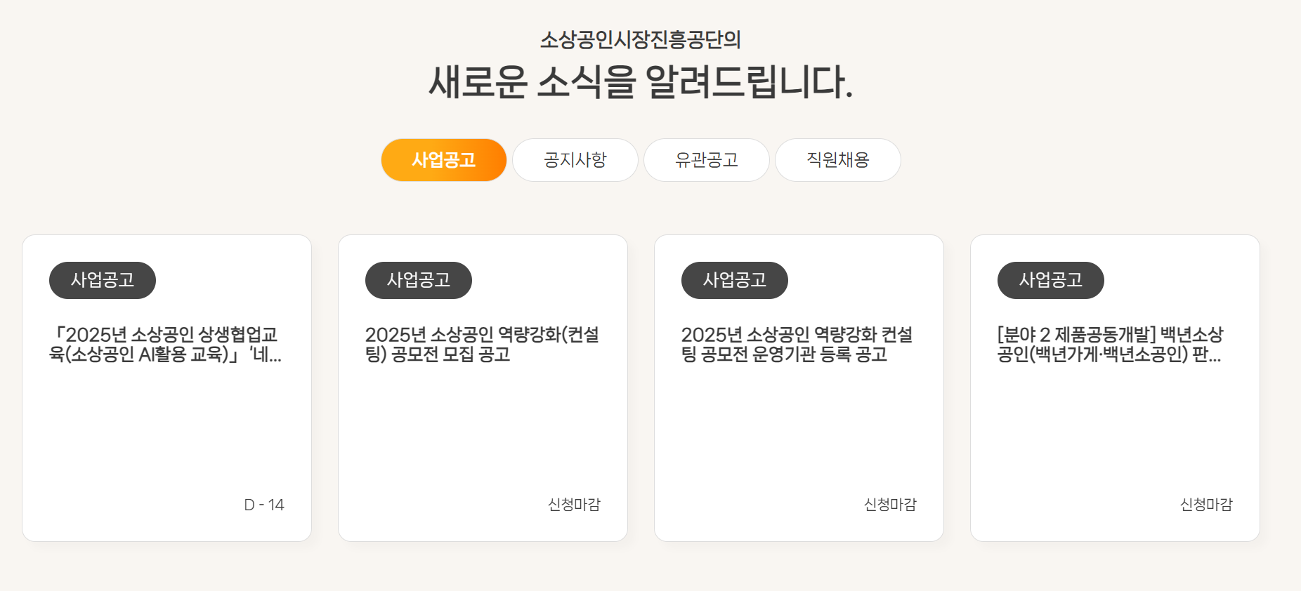 가장 많이 이용되는 기능은 홈페이지의 지원사업 조회입니다. 사용자들은 ‘접수 중·예정·마감’으로 구분된 사업 리스트를 바탕으로 참여 가능한 소상공인 지원사업을 빠르게 확인할 수 있습니다.