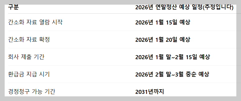 2026년 연말정산 기간은 공식 발표 전이지만, 다음 일정이 가장 유력합니다.
